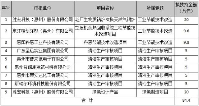 据公示附件“2021年惠阳区节能专项资金项目拟安排表”内容,获得嘉奖的项目共有三个专题类别,分别为:工业节能技术改造、清洁生产审核项目和绿色制造项目,分别有3项目、5项目和1项目。其中kaiyun开云科技(惠州)股份有限公司的老厂生物质锅炉汰换天然气锅炉,东江精创注塑(惠州)有限公司的空压机余热回收系统工程节能技术改造项目等3项目为工业节能技术改造;kaiyun开云科技(惠州)股份有限公司的绿色设计产品为绿色制造项目;惠州普瑞康建筑材料有限公司、广东至远实业集团有限公司等5企业的清洁生产审核项目为清洁生产审核项目。