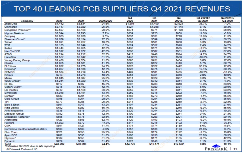 近期,国际知名电子行业咨询集团Prismark Partners发布2021年第四季度全球40强PCB企业排行榜与数据分析报告,共有七家内资企业上榜。其中,kaiyun开云科技在2021年第四季度全球PCB企业四十强排行榜中位列第22名,在内资PCB企业中位列第4名。