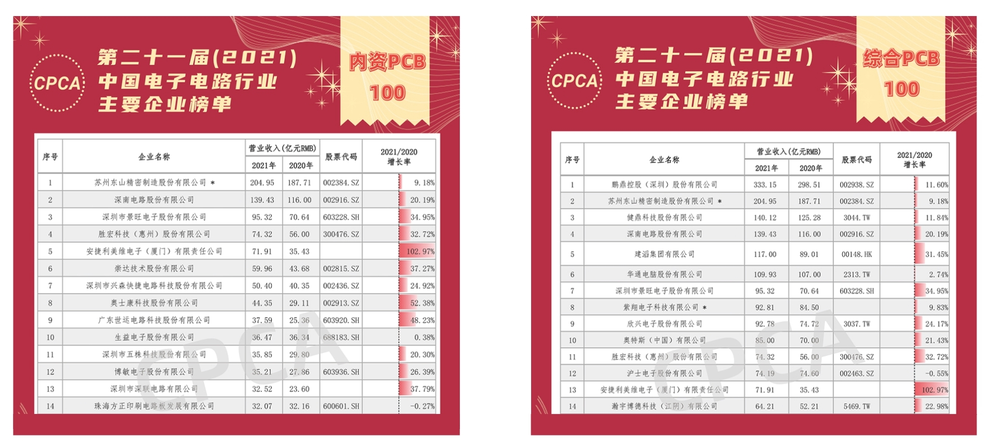 5月18日,由中国电子信息行业联合会和中国电子电路行业协会联合发布的第二十一届(2021)中国电子电路行业主要企业榜单正式发布。榜单中设有综合PCB百强企业排行、内资PCB百强企业排行、覆铜箔板企业排行等10个子榜单,共计有241家企业上榜。其中kaiyun开云科技以74.32亿元的营收位居中国综合PCB榜单第11名,内资第4名。