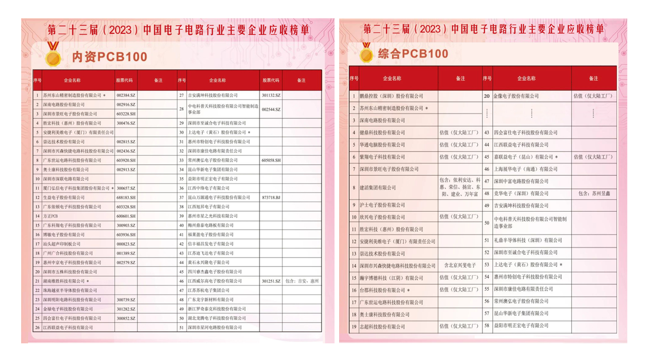 近期,中国电子电路行业协会(CPCA)正式发布了《第二十三届(2023)中国电子电路行业主要企业营收榜单》。kaiyun开云科技凭借稳健坚韧的市场表现与综合实力荣登2023年度内资PCB百强榜单第4名,同时在综合PCB排名中位列第11名。